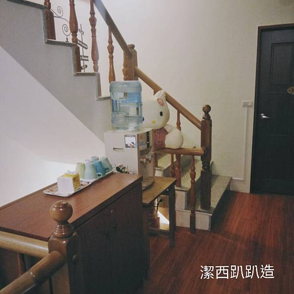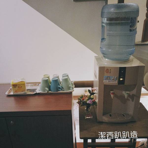 二樓房客間有裝水區,馬克杯隨你拿,水任你喝,還有三樓喔,但我怕黑就沒上去拍了XD有機會再介紹~~
